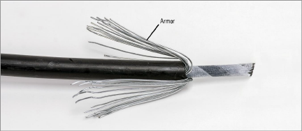 5.Strip the cable’s black outer jacket back approximately 40 mm (1.5 inches) from the end to expose the armor and wire leads.