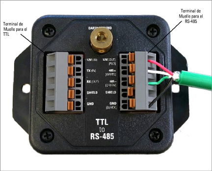 Conecte cada uno de los cables conductores del conjunto RS-485 a su respectiva terminal en el convertidor de bus direccionable, como se indica a continuación: